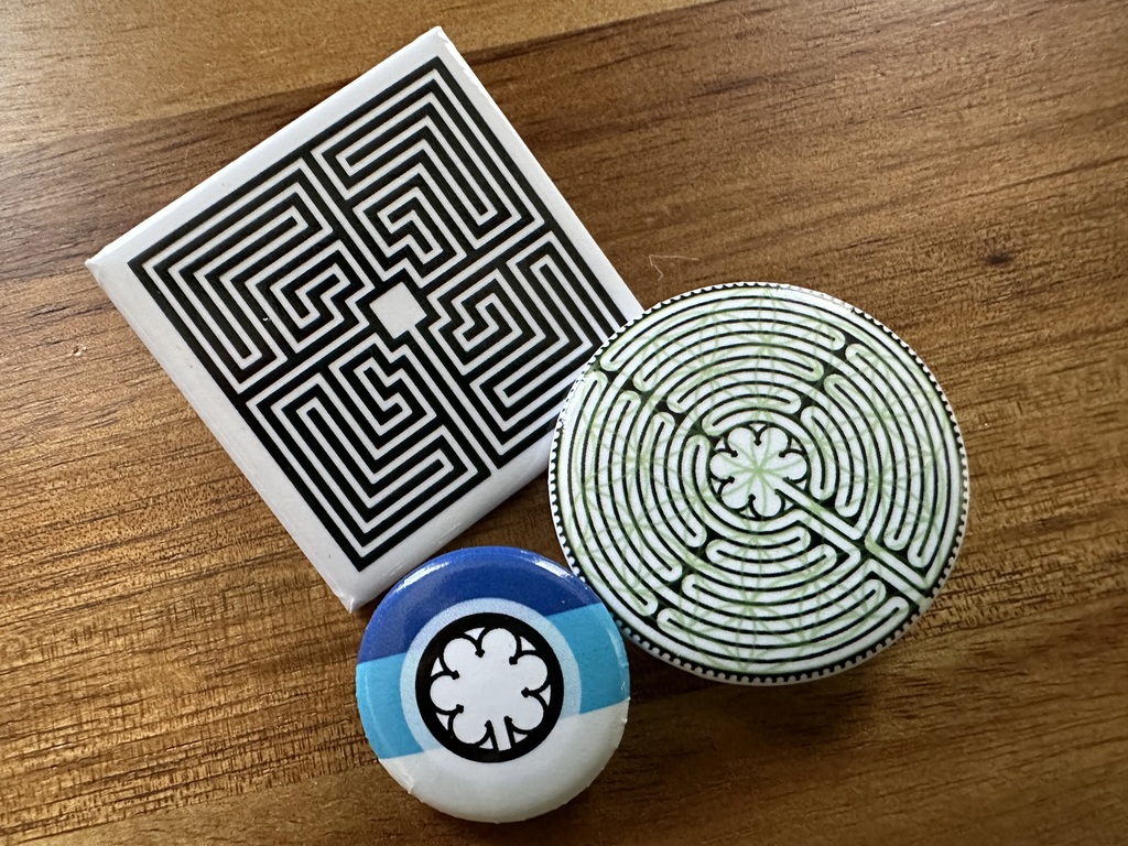 These three buttons that are great for adding a little labyrinth love to your style. Whether put on a backpack, pinned to a purse or worn with joy - this is a fun set found in our 2023 Auction!