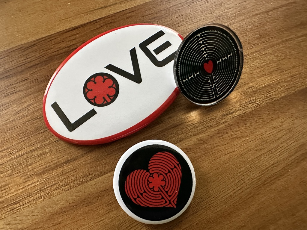 Three accessories from our popular Veriditas exclusive designs. 2 buttons and 1 acrylic pin - all with a heart/love theme. Share YOUR love of the labyrinth by wearing them or displaying them on your backpack or purse!