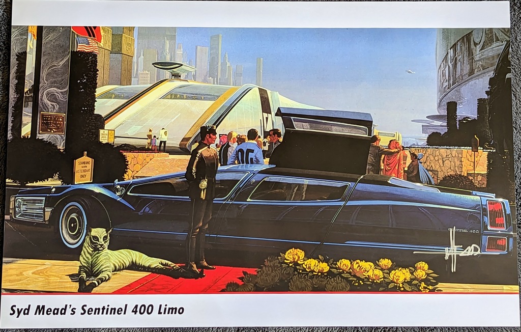 A futuristic car by designer Syd Mead. Autographed. The poster is on heavy stock and measures about 18" x 24"