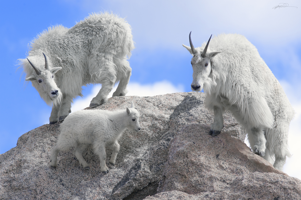 "I am a commercial photographer that likes to photograph wildlife for relaxation. I photographed the mountain goats on Mt. Evans in 1998 and it is one of my most popular. They popped up on the rocks above me while I was photographing in the opposite direction!