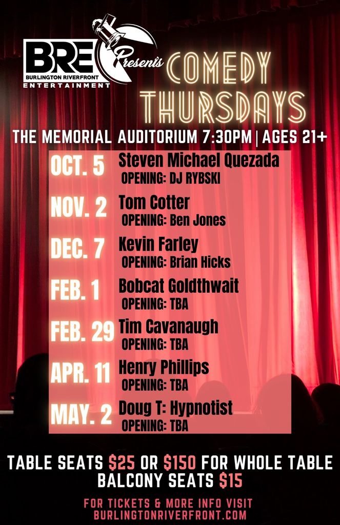 - two (2) table seat tickets to attend one (1) 2023 - 2024 Comedy Night of your choice (burlingtonriverfront.org/comedy)
