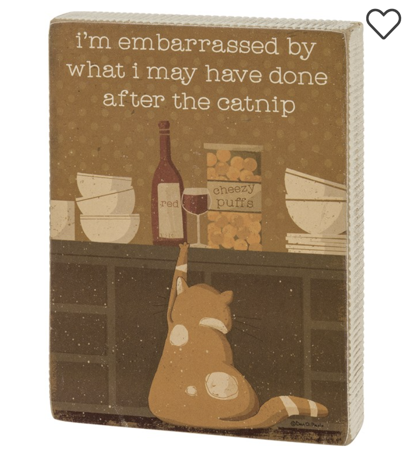 A rustic-inspired wooden block sign featuring an "I'm Embarrassed by What I May Have Done After the Catnip" sentiment with illustration of cat reaching for the counter. Easy to hang via predrilled keyhole slot or can free-stand alone.