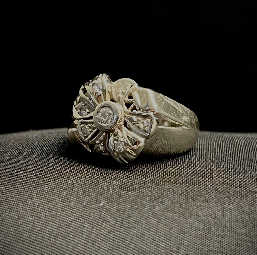 14KT WHITE GOLD LADIES DIAMOND FASHION RING. THERE IS ONE EUROPEAN CUT ROUND DIAMOND THAT IS .06CT AND SEVEN ROUND SINGLE CUT DIAMONDS THAT ARE .03CT EACH FOR A TOTAL OF .27CT. THE QUALITY OF THE DIAMONDS IS SI-1 IN CLARITY AND H IN COLOR. THE ONE DIAMOND IS BEZEL SET AND THE SEVEN ARE PRONG SET. ALL DIAMOND WEIGHTS ARE APPROXIMATE. Appraised value $1950.