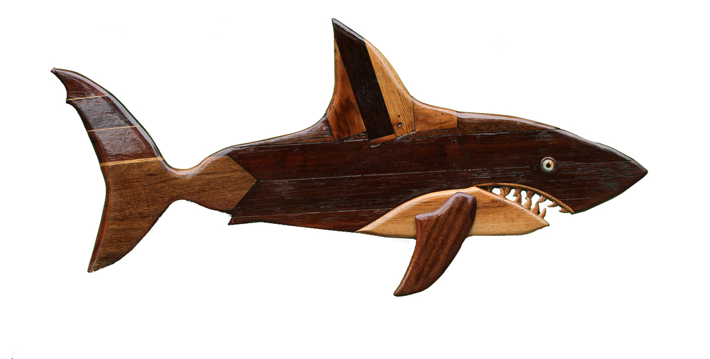 Wayne's whale & shark are both made from driftwood, reclaimed boat lumber, & antique dock stringers from Pt. Judith, RI, his home port. Much of his wood is c.1940s.