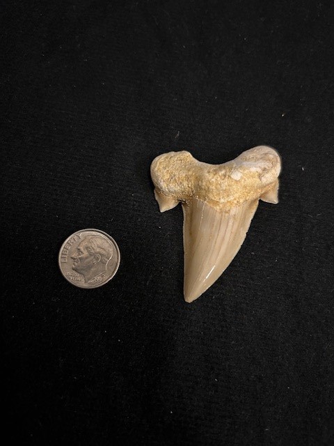 Cuspids on the sides! RIGHT ANGLED, Megalodon SHARK TOOTH. 2 million years old - with pointed "cuspids", visible on each side. Please see attached photos for exact dimensions (as compared to a US Dime). Discovered by Connecticut Scuba Divers, in the Atlantic Ocean, off the "Shark Tooth Ledge" near the North Carolina Coast (30 miles from shore, 110 feet underwater).