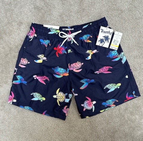 This item is NAVY BLUE (with multicolored Turtles) - in Size ADULT MEDIUM. It's a NEW "Trunks Surf & Swim Company" brand Bathing Suit / Swim Trunks. Quick-dry technology, mesh lining, rear pocket with adhesive velcro to keep closed. Available for nationwide bidding. Item can be shipped to Winning Bidder or picked up for FREE in Enfield, CT after the Auction. Fun style, great fit!