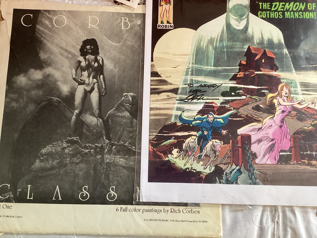 (2) Ron Garney signed Wolverine prints, (2) not sure signed 1 Wolverine, 1 Superman, 1 signed Batman print, lamenated, (6) Larry Elmore 1992 Prints, 1 Set of 1986 Rich Corben, Q Productions Prints.