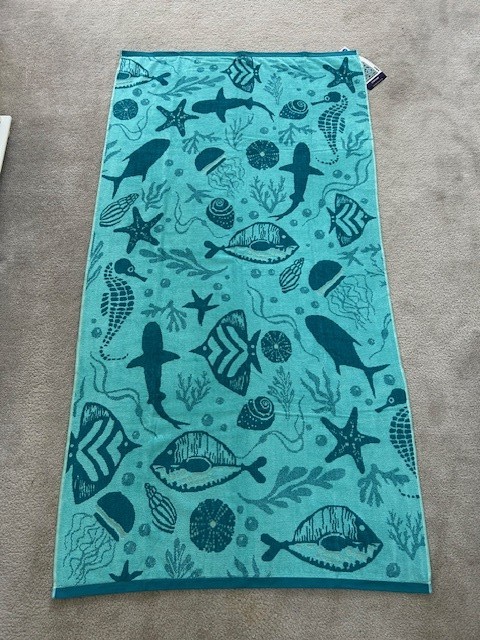 New with Tags - Great Color! BEAUTIFUL: Big, warm, comfy Towel. Perfect Holiday Gift: Buy now and put away for the next Holiday or Birthday. Ideal Gift for any Ocean Lover - or use at the Beach, Bath, Picnics, Boat, or Pool. (Note: There are 4 of this same Towel in this Auction, if you would like Matching Sets, for family and friends.) OVERSIZED LUXURY TOWEL - to wrap yourself up (it's 7 foot length by 3 foot width). Towel has a REVERSIBLE Design, with light colored same-pattern of Sharks, Fish, and Coral - in a popular Teal Color (see photos). Easy Laundry care: this Towel is machine-washable and can be placed into the Dryer. (Contains 83% Cotton and 17% Recycled Polyester.) Available for shipping nationwide to Winning Bidder - or pick up for FREE in Enfield, CT. One of our favorite patterns!