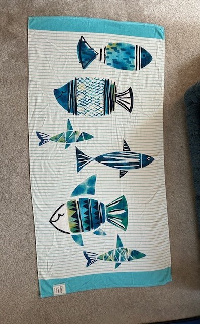 Beautiful Fun Colors (and New, with tags)Awesome "Fish Towel".  This item is for ONE (1) single Fish Towel.  (Note: There are 2 more of this identical Towel within our Auction, if you would like Matching Sets, for family and friends.)   SUPER-BIG SIZE, to wrap yourself up - at the Beach, Boat, Picnics, or Pool.  100% Cotton.  Oversized wrap-around style (it's 72" wide x 36" high). Towel has a Reversible Design, with light colored same-pattern on white - in aquatic blue, aqua, and turquoise colors.  Easy laundry care: this "Fish Towel" is machine-washable and can be placed into the Dryer.   Available for shipping nationwide to Winning Bidder - or pick up for FREE in Enfield, CT.  Buy now - and save as a Holiday Gift for your favorite Ocean Lover!  (Our favorite design!)