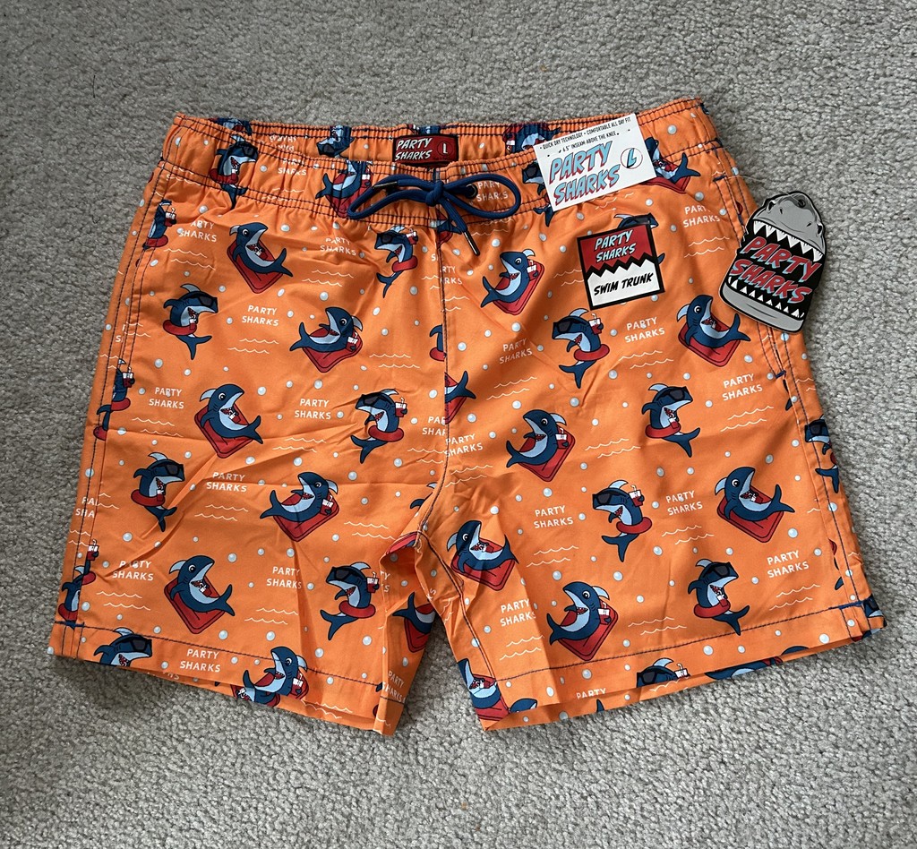 This item is ORANGE, Size ADULT "EXTRA LARGE". It's a NEW "Party Sharks" brand Bathing Suit / Swim Trunks. Quick-dry technology, mesh lining, rear pocket with adhesive velcro to keep closed. Available for nationwide bidding. Item can be shipped to Winning Bidder or picked up for FREE in Enfield, CT after the Auction. Fun style, great fit!