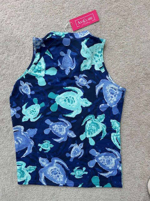 Turtles - Sun Shirt (SPF 50 Protection).  Stylish and comfortable "Zip Front" Sleeveless Shirt.  Navy blue / lavender / green - with adorable Turtles.  (Brand new, with tags, $54 value - you can see it on the "AnaClare Active" Website.)  This item is a Shirt, Size "Medium".  (Equivalent to Women's Size 8 to 10.)  Note: We also have other items in the Auction in similar Ocean-themed patterns (and in different sizes) to match with Family and Frineds.  AnaClare is known for their easy-care apparel, with designs to empower and inspire women. So comfortable: wear for Dinner, Brunch, Golf, Beach, or Parties. This is their "Katie Top" in the sold-out "Turtle Style".  Elegant and fun! 85% Polyester 15% Spandex, SPF-50 Sun Protection.  Machine washable.  Item can be shipped nationwide to Winning Bidder (with insurance) - or picked up for FREE in Enfield, Connecticut. Buy now and save for the Holidays!