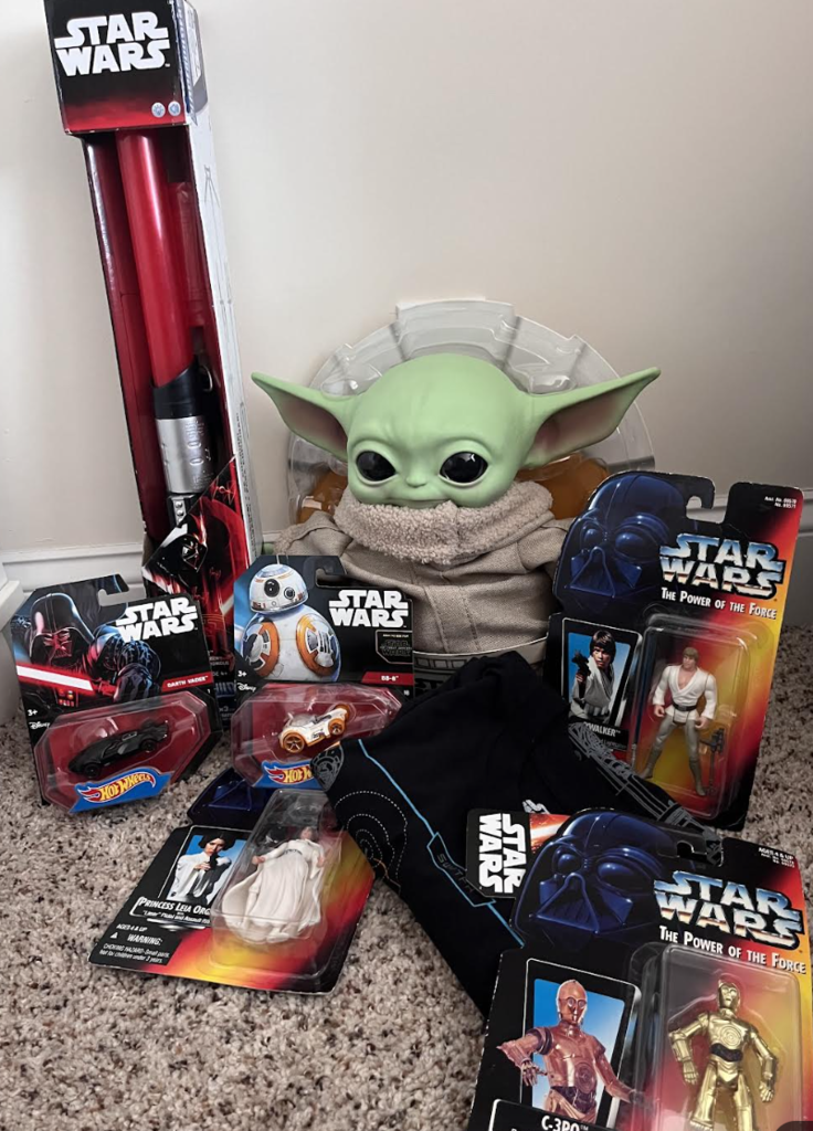 Attention Star Wars lovers? Here you have the Mandalorian, the child? Very desired toy? Coupled with 3 of The Power of the Force figurines, two hot wheel cars, an action packed Darth Vader electronic light saber and an adult size medium T-shirt