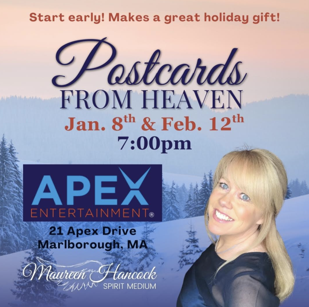 Join internationally renowned spirit medium Maureen Hancock for a heartwarming evening filled with laughter, tears, and unforgettable connections. This is 2 General Admission tickets for the Thursday, January 8th show at Apex Entertainment in Marlboro!