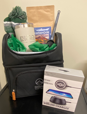 Enjoy this cozy gift basket from Katahdin Trust! Includes a cooler, ByTech wireless cell phone charger, fleece vest (Size L), Katahdin branded winter hat, Yeti Tumbler, Katahdin branded coffee from Wildlife Coffee Company, and coffee scoop!