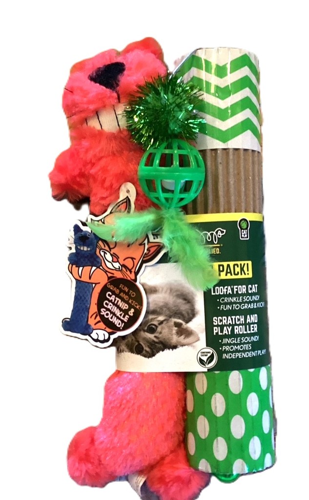 This set measures 10 inches long and includes: A cardboard roller cat scratcher Satisfies your kitty's natural scratching instincts while helping groom her nails. It contains U.S. catnip for added enticement and excitement.The roller features a pom-pom, a bell, and a feather for play. A Loofa cat kicker with crinkle sound and catnip. Fun to grab and kick.