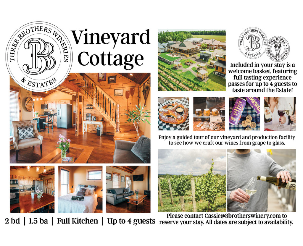 Escape to the heart of the Finger Lakes with a relaxing two-night stay in a charming vineyard cottage at Three Brothers Wineries & Estates in Geneva, NY. Wake up among the vines, unwind in your cozy private retreat, and experience the beauty and hospitality that make this destination so special.