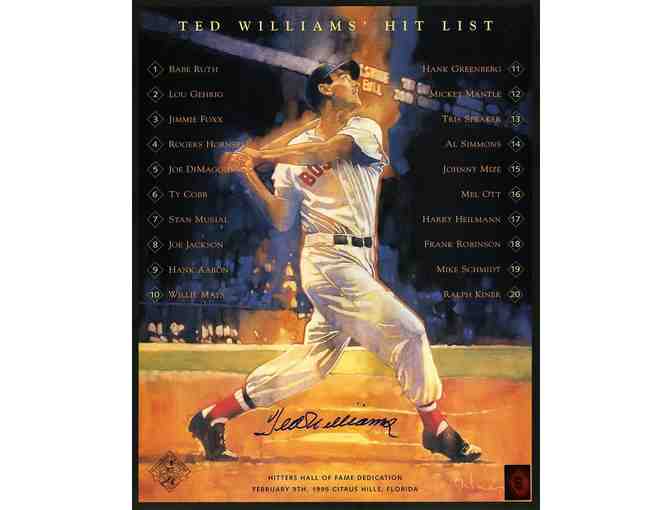 Red Sox Legend Ted Williams has personally hand-signed this hit list 16x20 photo - Ted Williams was considered one of the best hitters of all time and some would argue that if it wasn't for three years serving in World War II he could have gone down as the greatest player ever. He compiled a .344 lifetime average with 521 home runs and over 2000 RBIs and of course he was the last player to hit over .400 doing so in 1941 with a .406 average. This Ted Williams autograph is Green Diamond authenticated.