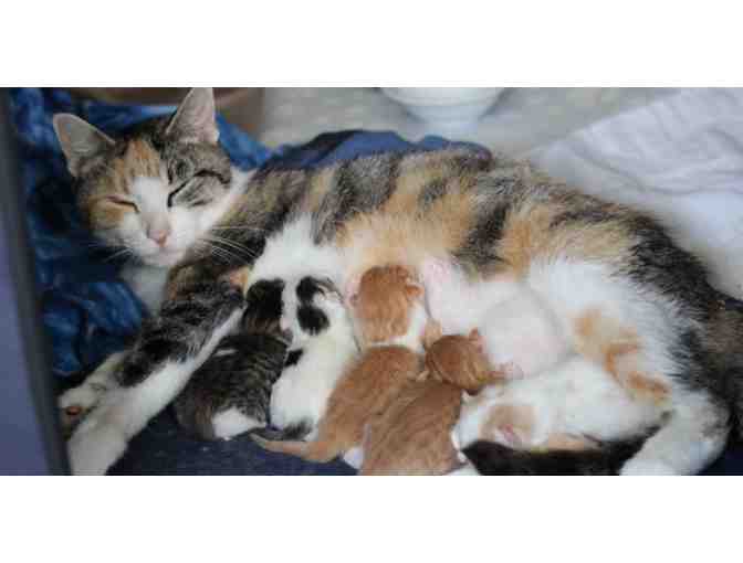 Includes supplemental kitten milk, bottles, wipes and wellness checks for mom and kids.