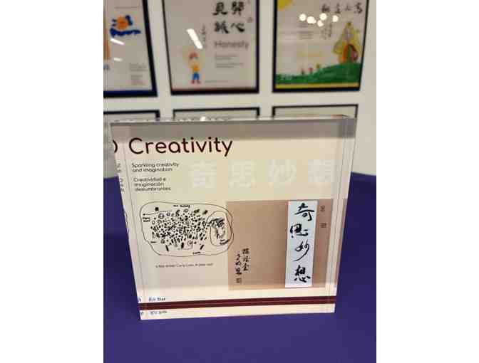 Creativity is a dazzling expression of imagination, crafted by four-year-old Carly Lam. The piece blends the elegance of traditional Chinese calligraphy with the unfiltered wonder of a child’s drawing. The inscription reads: “Sparkling creativity and imagination,” also translated in English and Spanish, reminding us that creativity is a universal spark that lights the way for discovery and growth.