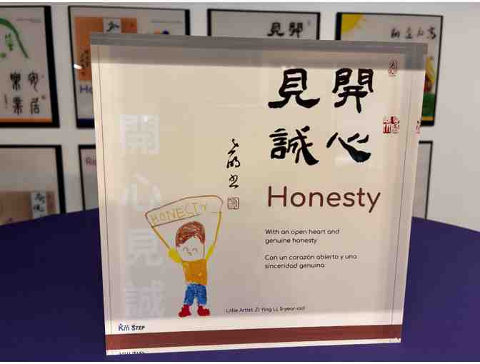 Created by little artist Zi Ying Li, age 5, this heartfelt piece captures the pure spirit of childhood honesty. With bold strokes of Chinese calligraphy alongside a joyful hand-drawn figure holding up the word HONESTY, Zi Ying reminds us that truth and openness shine brightest through the eyes of children. The message, written in English, Spanish, and Chinese, beautifully bridges cultures and communities, reflecting the universal value of sincerity.