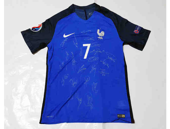 2016 France Euro Cup Team Signed Soccer Jersey. Paul Pogba, Benoit Costil, Hugo Lloris, Steve Mandanda, Lucas Digne, Patrice Evra, Christophe Jallet, Laurent Koscielny, Eliaquim Mangala, Adil Rami, Bacary Sagna, Samuel Umtiti, Yohan Cabaye, Morgan Schneiderlin, N'Golo Kante, Blaise Matuidi, Moussa Sissoko, Kingsley Coman, Andre-Pierre Gignac, Olivier Giroud, Antoine Griezmann, Anthony Martial, Dimitri Payet, Didier Deschamps. Comes with certificate of authenticity.