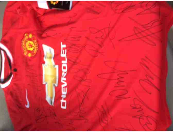 Manchester United Team Autographed Soccer Jersey. Signatures include 1. de Gea 2. Shaw 3. Jones 4. Marcos Rojo 5. Evans 6. Di María 7. Mata 8. Januzaj 9. Carrick 10. Young 11. Herrera 12. Fletcher 13. A Valencia 14. Fellaini 15. Blind 16. Rooney 17. van Persie 18. Falcao 19. Giggs 20. Louis van Gaal. Comes with certificate of authenticity.