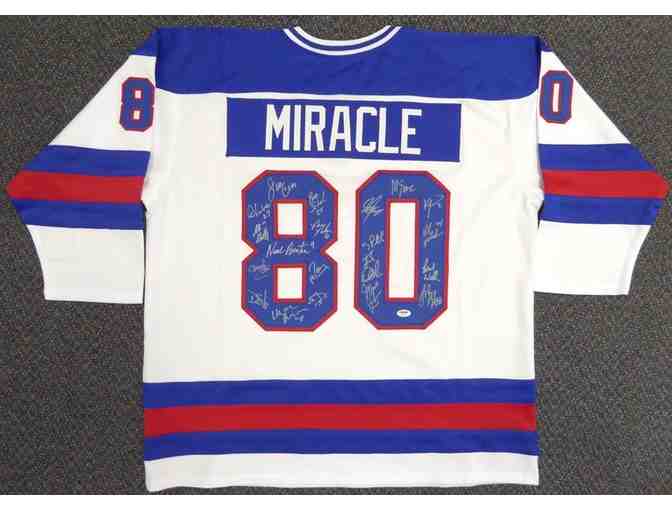 Signed by 20 players and coaches from the 1980 Team USA Miracle on Ice Hockey Team. Signatures include Mike Eruzione, Jim Craig, Jack O'callahan, Ken Morrow, Mark Johnson, Bill Baker, Buzz Schneider, Craig Patrick, Dave Christian, Dave Silk, Eric Strobel, Mark Pavelich. Mark Wells, Mike Ramsey, Neal Broten, Phil Verchota, Rob McClanahan, Steve Christoff, Steve Janaszak, John Harrington.