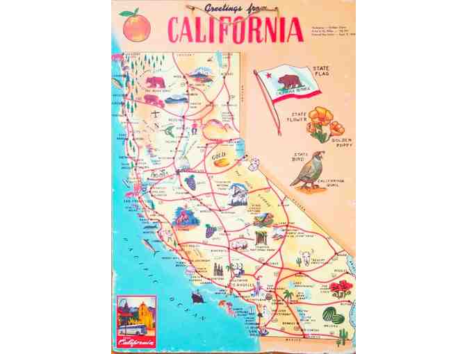 Vintage California Map Poster. This is mounted masonite type wood. Appoximately 18.75 inches wide and 26.75 inches tall.