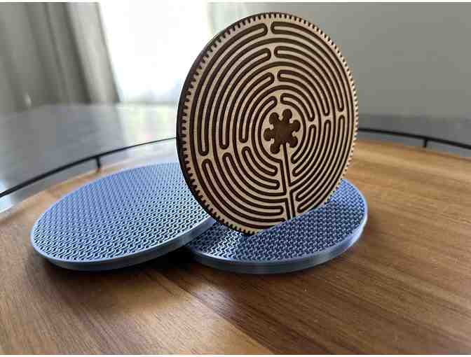 5 inch HAND-HELD WOODEN LABYRINTH - with unique protective case/stand and stylus. This item invites you to travel on a path of meditation and enlightenment... on the reverse of the labyrinth are the words: Blessings on Your Path