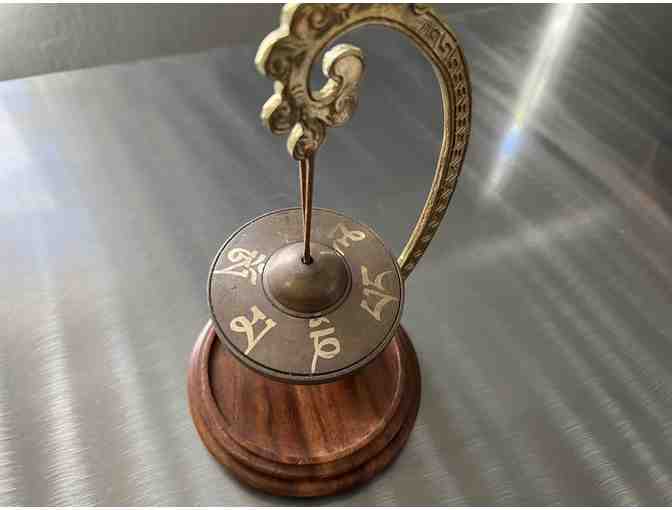 This handsome table chime is made by Tibetan and Indian metalcraft artisans in India. The chime is handcast using an ancient sand-casting method, hand-tuned in finishing and embellished with the sacred Tibetan mantra, Om Mani Padme Hum. Strung with a handsome waxed cotton cord. Excellent for use in meditation, teaching settings or as an attractive table top decoration. Ships flat and assembles easily.