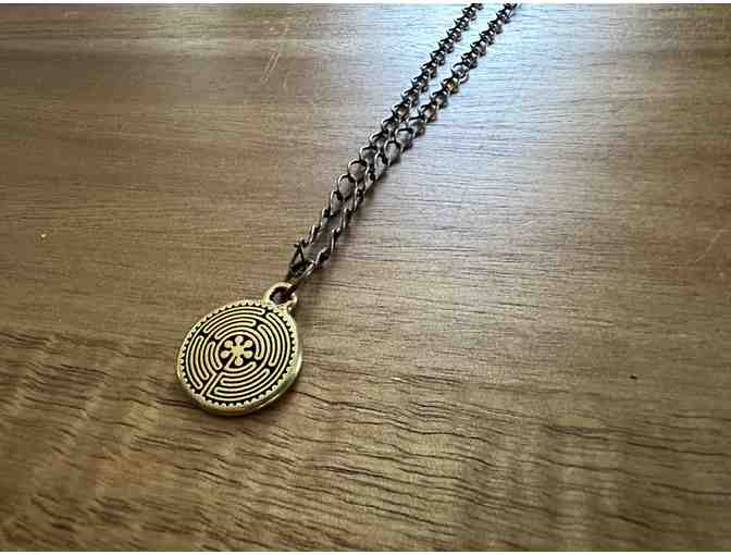 This golden-hued, dual-sided pewter labyrinth charm is elegantly and attractively suspended from with a delicate chain. Simple. Elegant. Delicate.