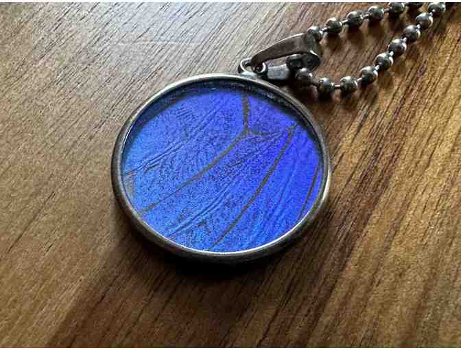 This beautiful necklace features a delicate butterfly wing. Paired with a simple and sturdy ball chain. The medallion is approximately the size of a quarter.Sustainably harvested from the forest floor. No butterflys were harmed to create this fabulous jewelry! This wing is displayed on either side of the pendant.