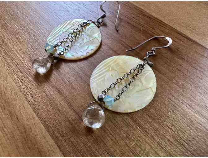 These darling earrings have arrived from the land of Aloha. Subtle rainbow sheen over the shell circle, which features a delicate engraved bird. Two tiny accent crystals finish of these earrings. These quarter-sized earrings are lightweight & pretty!