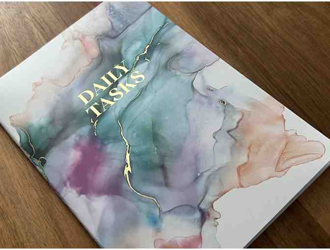 A beautiful journal available in this auction is this Daily Task Journal. With it's soulful watercolor and delicate gold foiling effect of the cover (including the simple "Daily Tasks" embellishment on the front), who wouldn't want to open it and write something everyday?