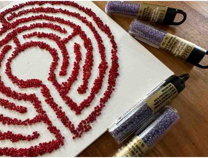You will receive a beautiful crimson-colored, hand-beaded finger labyrinth and materials to make a second purple labyrinth to give as a gift or frame as art.
