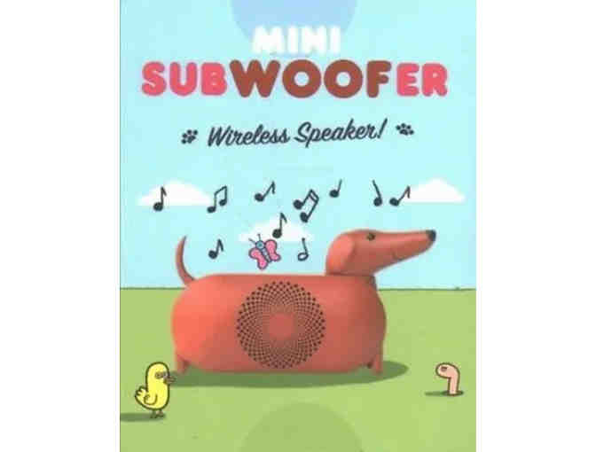 Jam out with the help of man's best friend--the Mini SubWOOFer. 3" dog-shaped wireless speaker Miniature USB cord 32-page illustrated mini book.