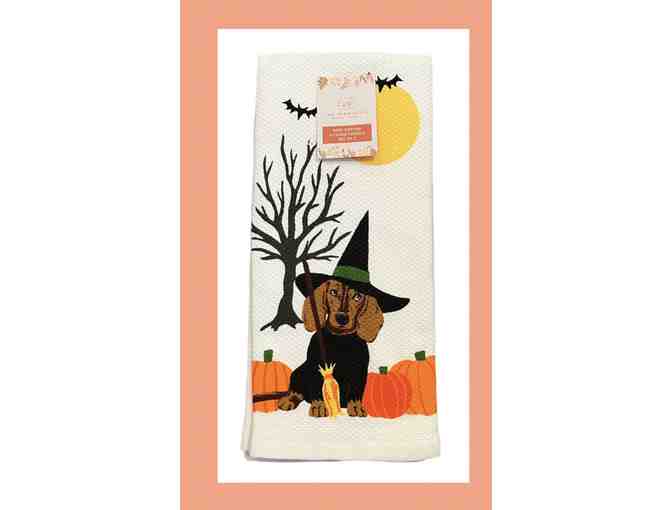 Two (2) 100% cotton kitchen towels. Both have a dachshund dressed as a witch! Measure approx 18" x 28".