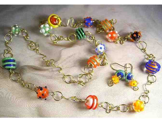 Brightly colored tactile glass beads with swirls and bumpy dots enhance this great necklace with matching earrings. Each link is handmade from gold-tone wire with lots of curves and loops. This necklace will be lots of fun to wear and will brighten any outfit. Necklace is approximately 30 inches long. This charming jewelry set includes matching earrings.