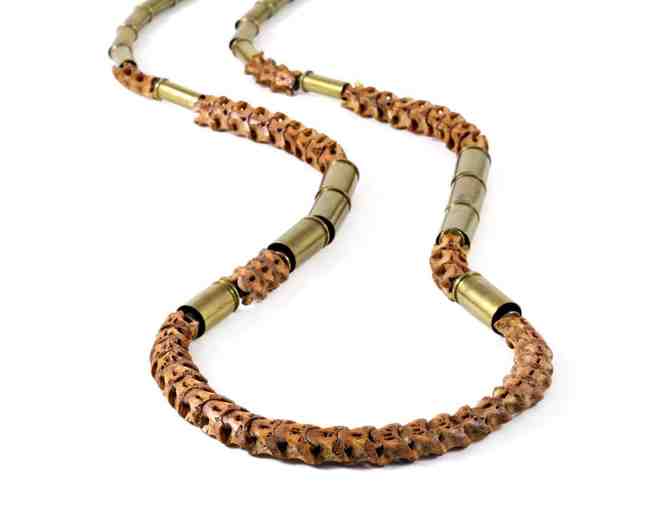 A true statement piece, the Snake Vertebrae Necklace is 40 inches of African Snake Vertebrae, recycled brass bullet casings, and brown leather cord. Vertebrae color ranges from tan to brown, depending on the individual skeleton. Bullet calibers used are .22 and 9mm. Finished with a brass lobster clasp.