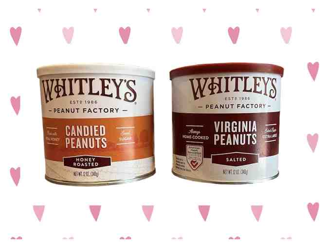 The highest bidder of this fabulous item will receive one (1) 12 ounce can of Whitley's brand Honey Roasted Candied Peanuts made with real honey & one (1) 12 ounce can of Whitley's brand Select Super Extra Large Salted Virginia Peanuts.
