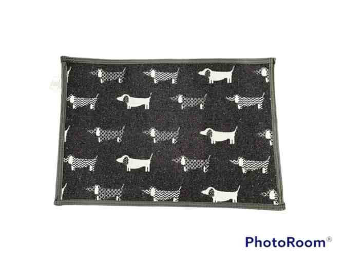 60% cotton; 40% polyester. Measures approx 14" x 19". Slide & skid resistant. Absorbs spills quickly. Machine washable. Loom woven design.