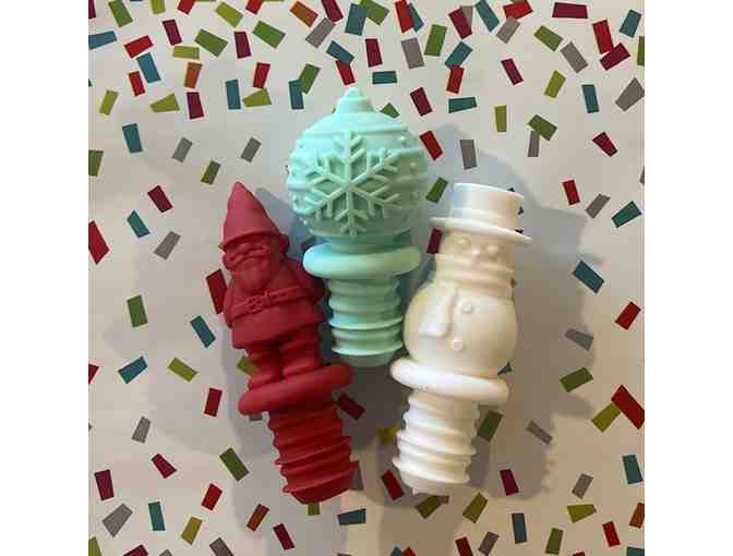 These 3 matching bottle stoppers are each approx 3" x 1.5", made of Silocone, new and unwashed. Perfect for at home holiday spirits.