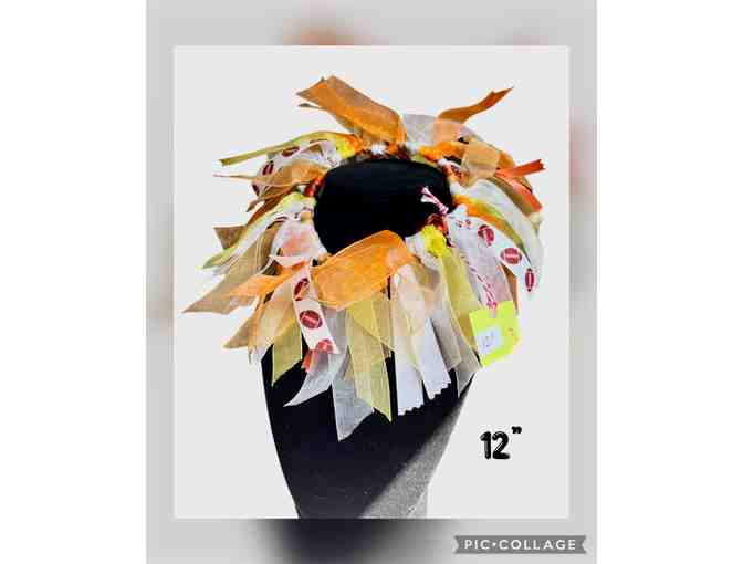 This collar was handmade by Margy Hofsass! The elastic is 12" so it will stretch OR you can tighten it for a smaller pup. This has approx 2" - 3" of ribbon dangling from the collar. Perfect to dress your pup up for the big game!
