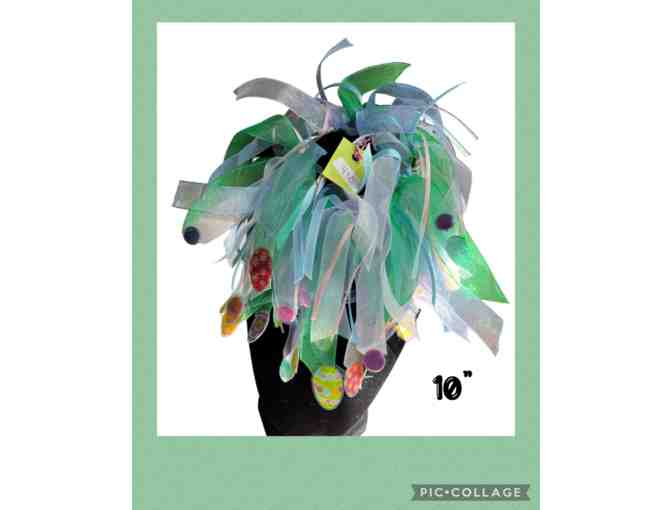 This collar was handmade by Margy Hofsass! The elastic is 12" so it will stretch OR you can tighten it for a smaller pup. This has approx 4" - 5" of ribbon dangling from the collar. Decorated with lovely Easter eggs!