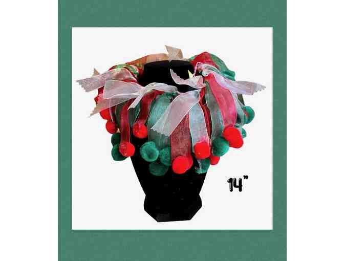 This collar was handmade by Margy Hofsass! The elastic is 14" so it will stretch for a larger pup OR you can tighten it for a smaller pup. This has approx 3" - 4" of ribbon dangling from the collar with 1/2" pompoms. Perfect to dress your pup up for the holidays.