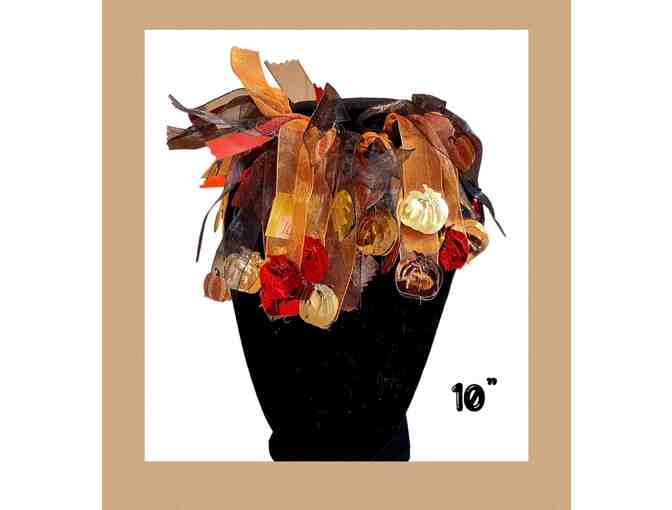 This collar was handmade by Margy Hofsass! The elastic is 10" so it will stretch OR you can tighten it for a smaller pup. This has approx 3" - 5" of ribbon dangling from the collar. Decorated with different kinds of fun pumpkins for Halloween or Fall!