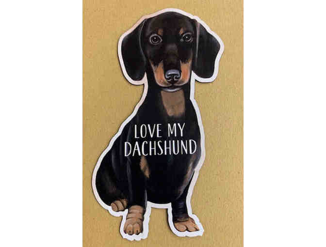 Check out this magnet!!  A 4 1/4” tall, 2 ¼” wide flat, flexible die-cut magnet that says “Love my Dachshund.”