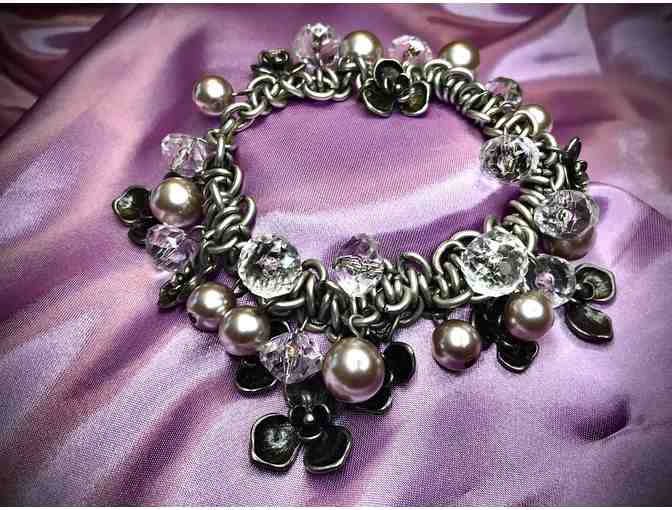 Dazzling bracelet/anklet adorned with silver toned beads, clear jeweled beads and darkened metallic flowers. This item is a unique, exquisite accessory that will transform your style.