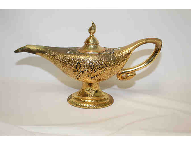 This is a truly amazing item from the Broadway production of Disney's Aladdin. This is a stage used Genie's lamp. It's a fantastically detailed item that includes magnets for the lid as well as to hold the lamp in place if it's on a metal surface. The lamp has been autographed by Broadway's original Genie - Tony Award winner James Monroe Iglehart as well as current Genie Michael James Scott.