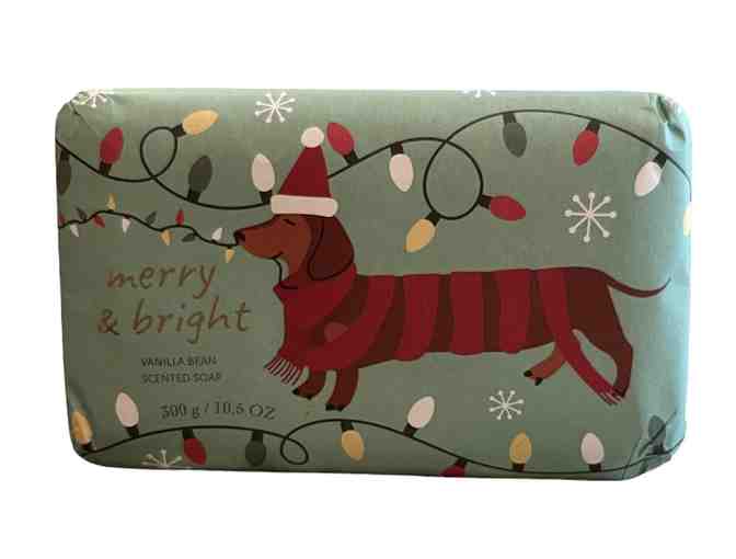 This is a very large bar of vanilla bean scented soap with a Christmas Dachshund on the front! It weighs 300 g / 10.5 oz.